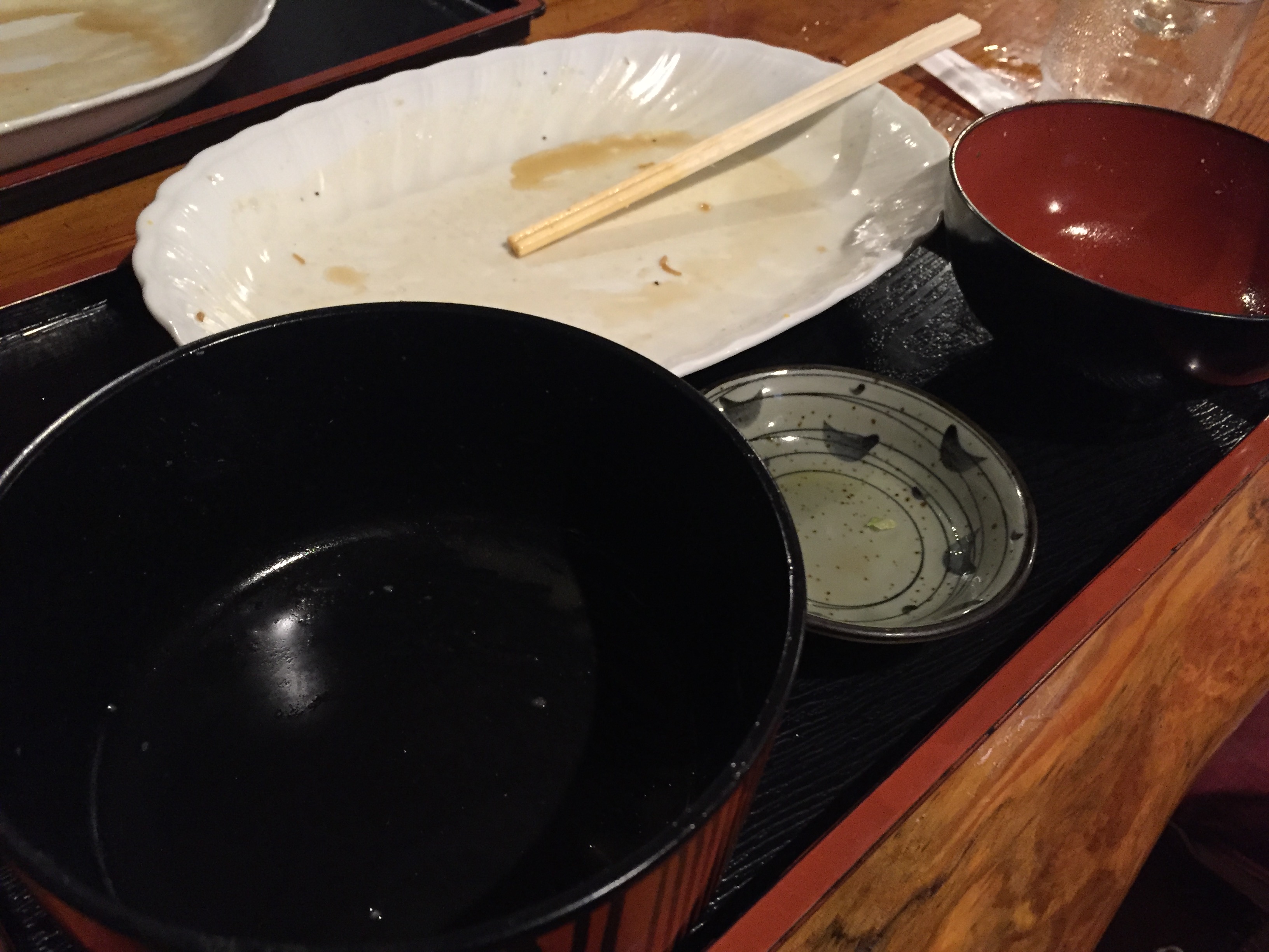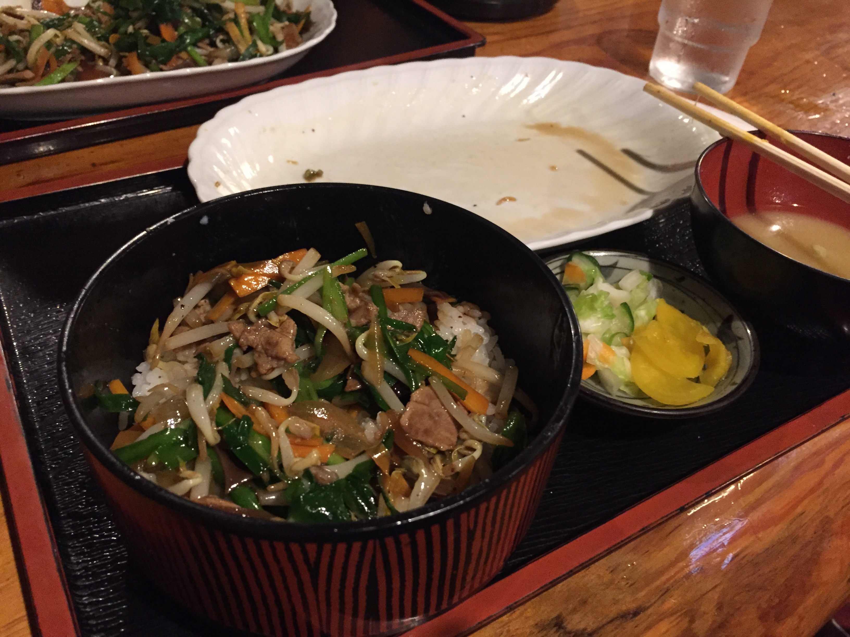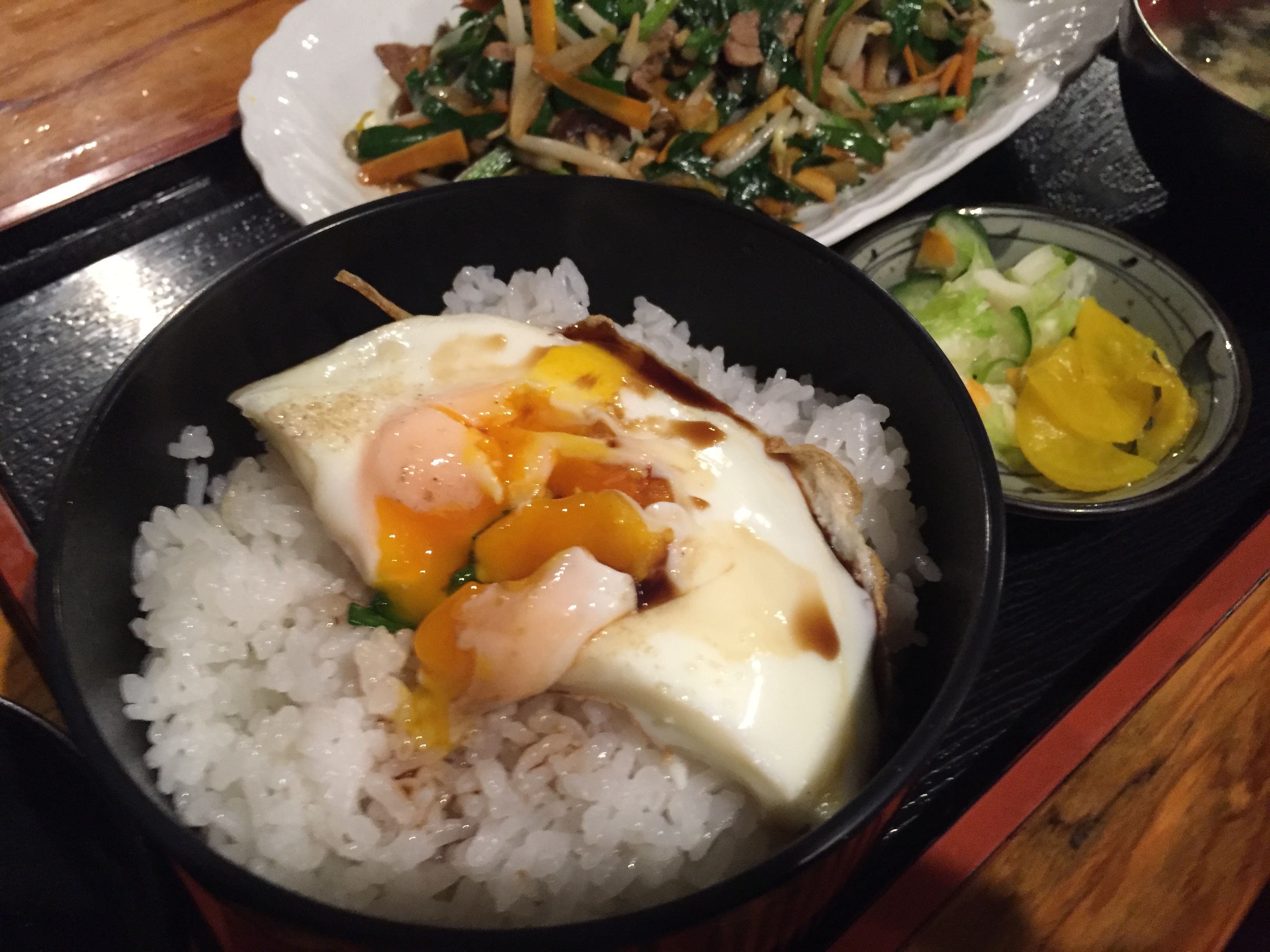 半熟卵ご飯を食べ終えニラ炒めもあと少しになったところで