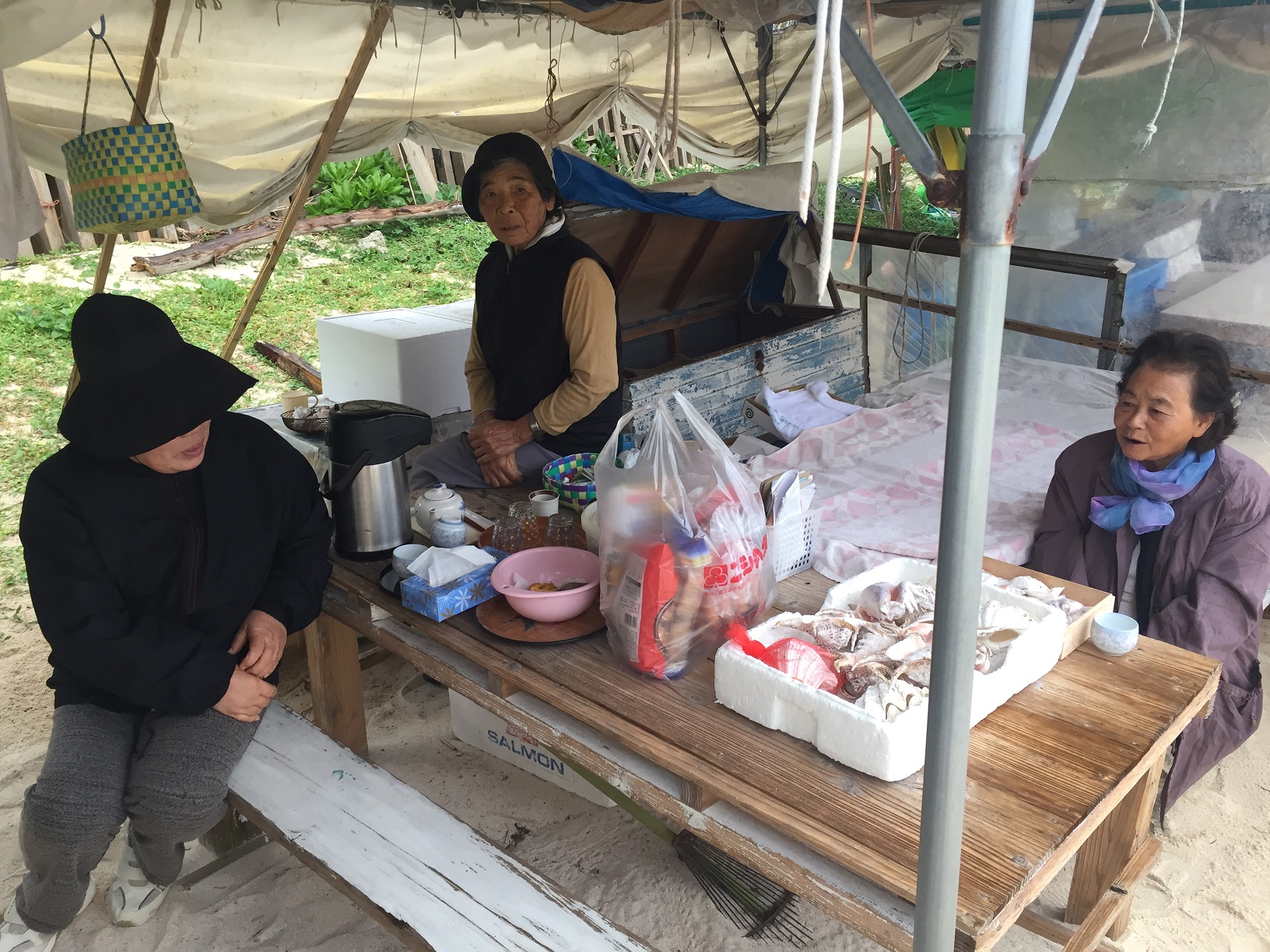 大金久海岸のお母さん達のアクセサリー露店です。