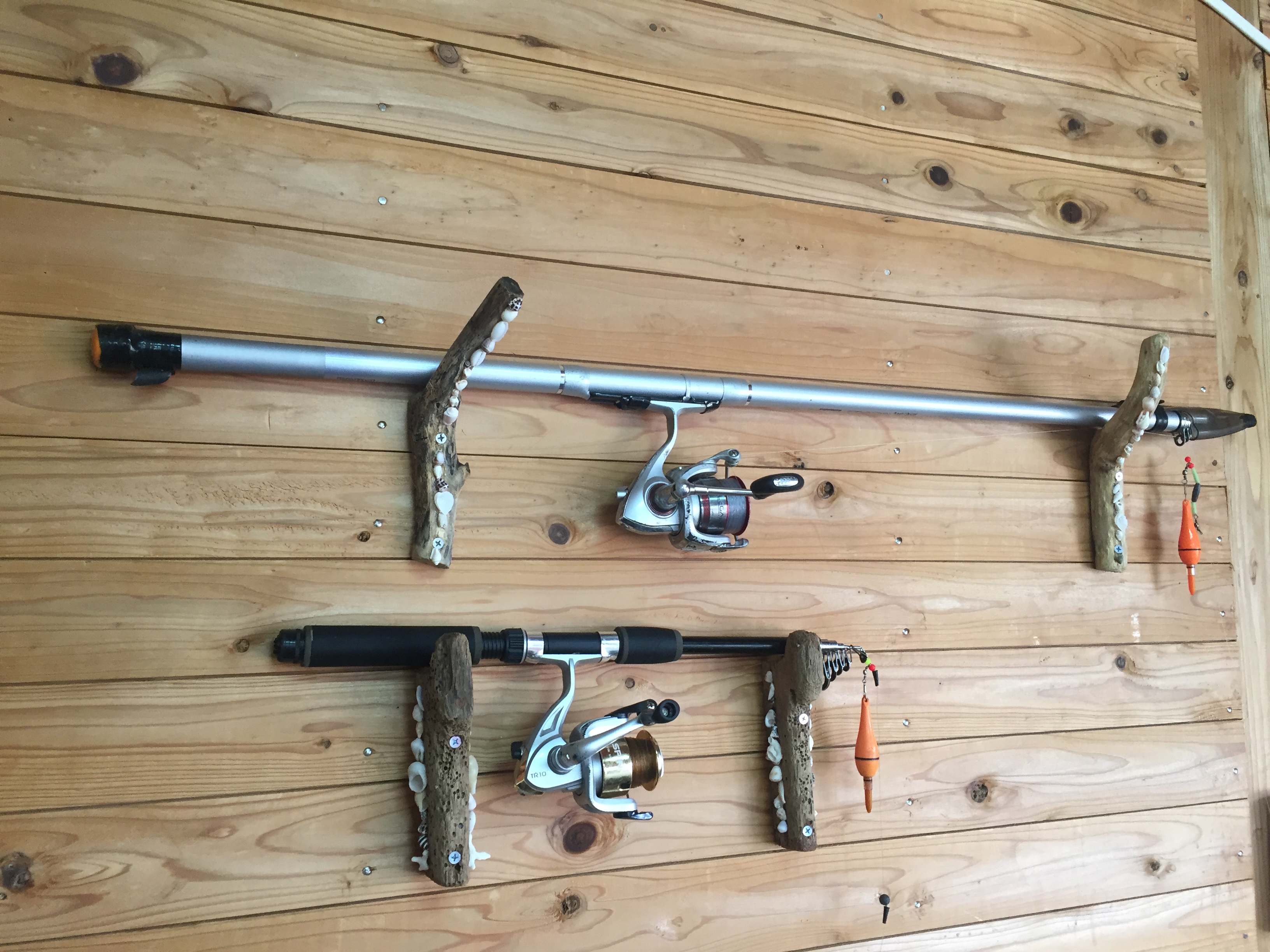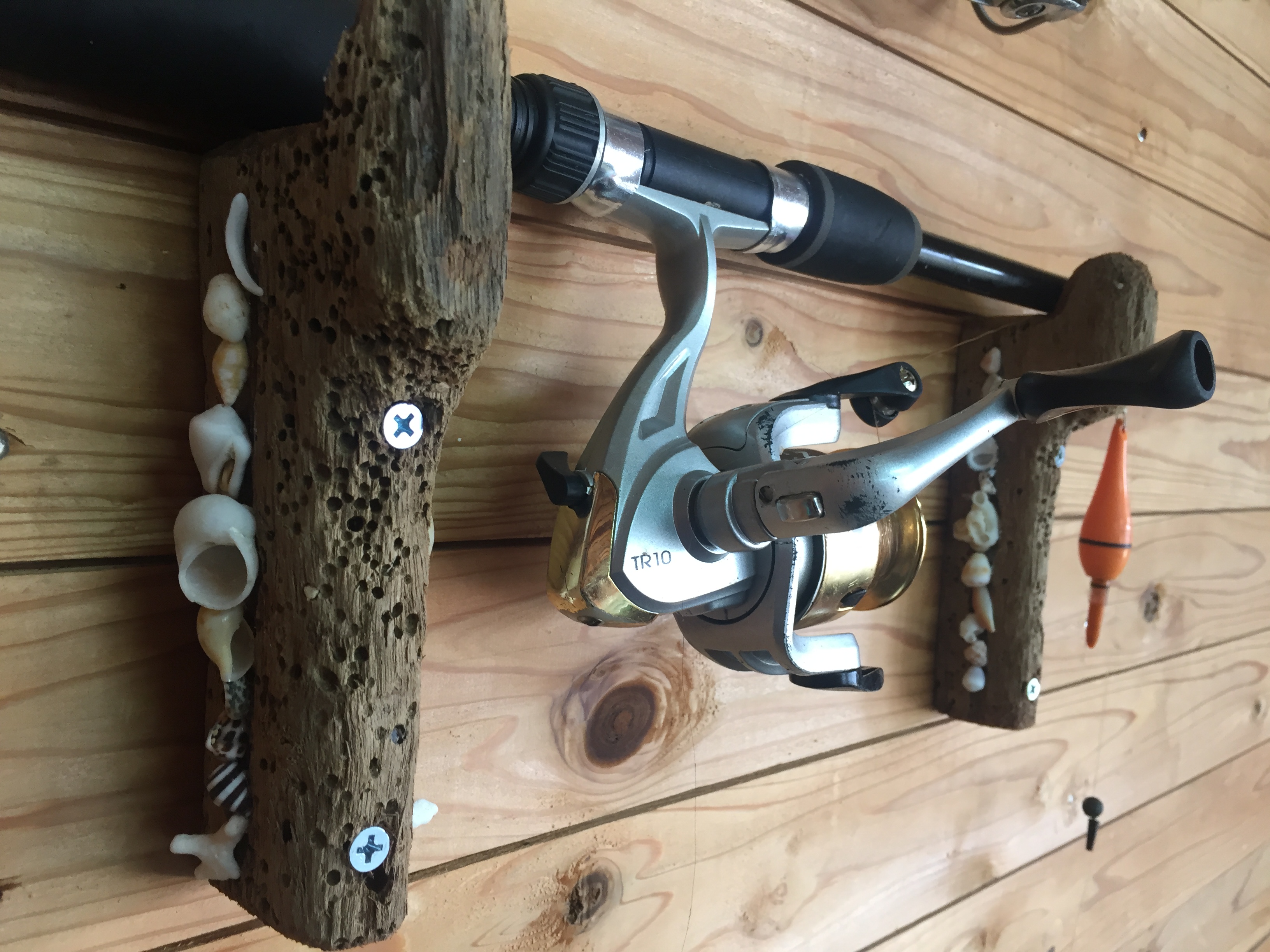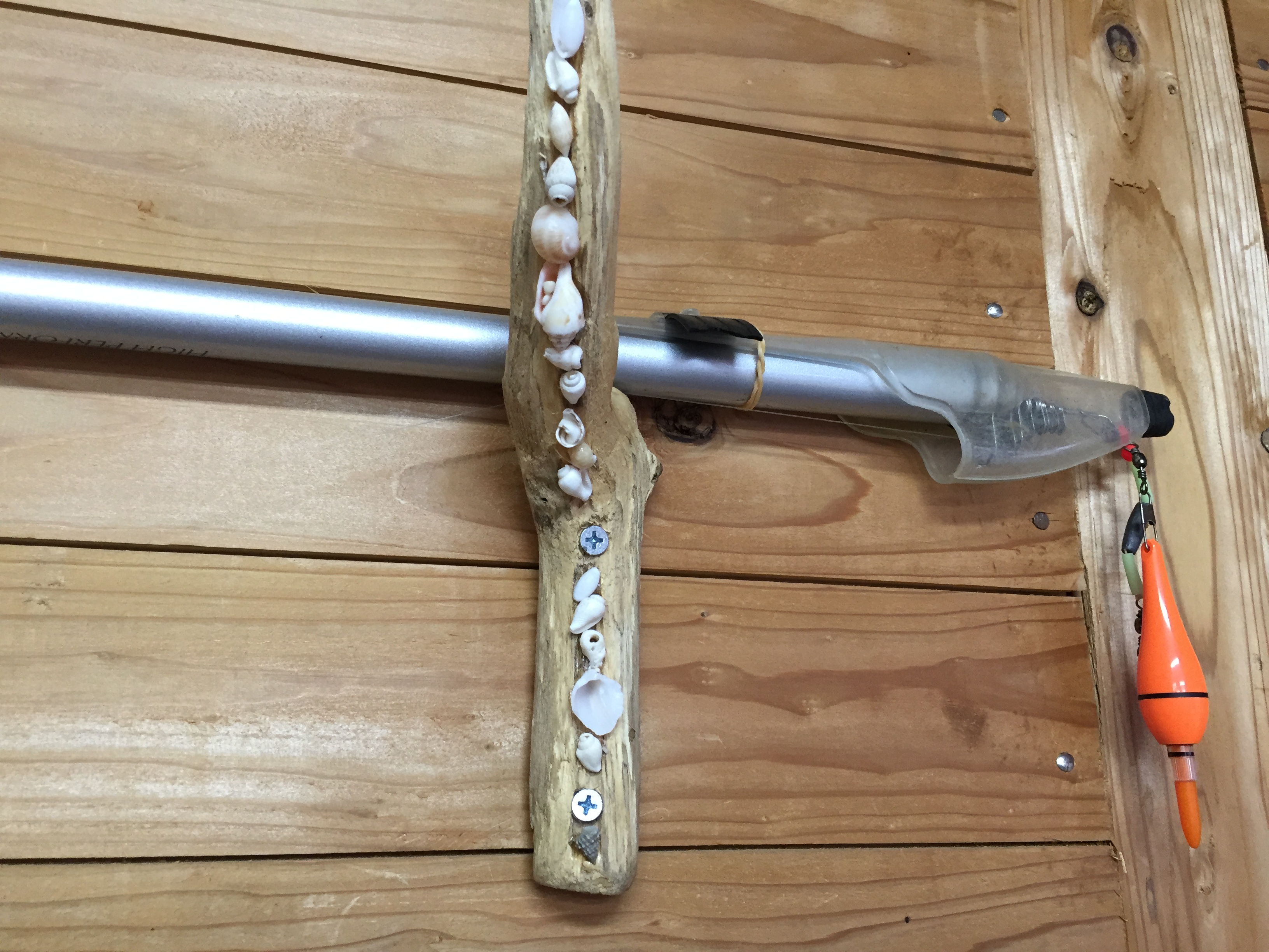 いい感じっこな流木を貝殻であしらったお手製の釣り竿置きまで♡